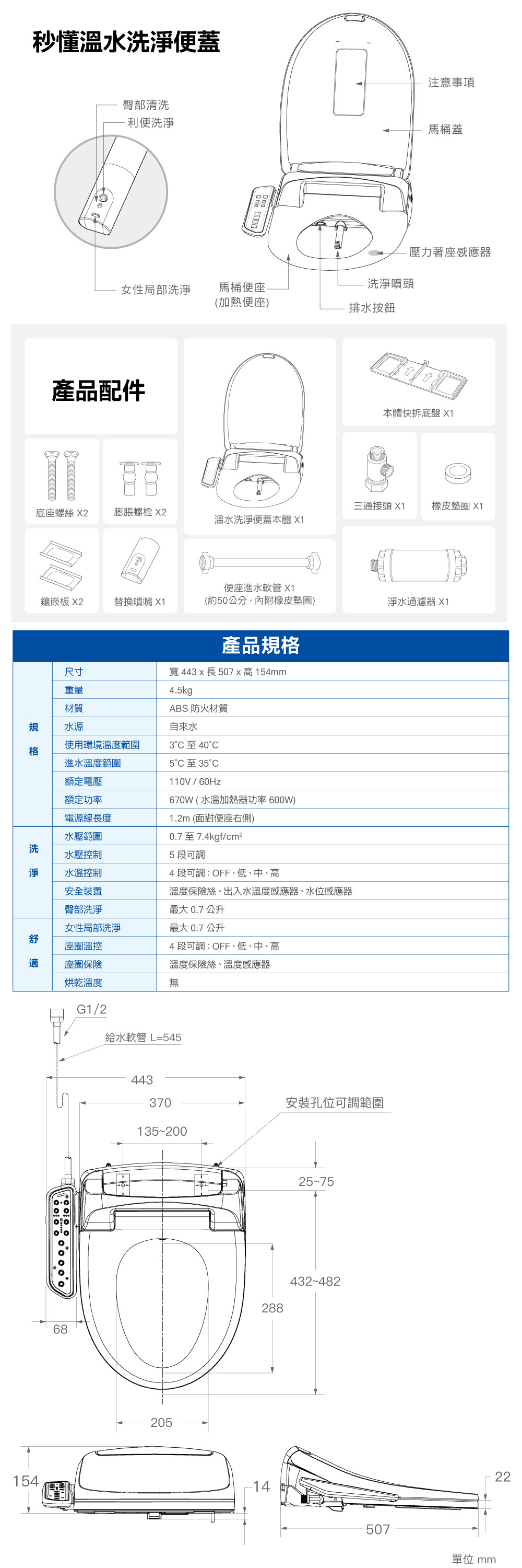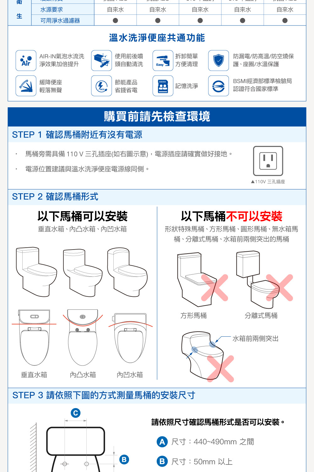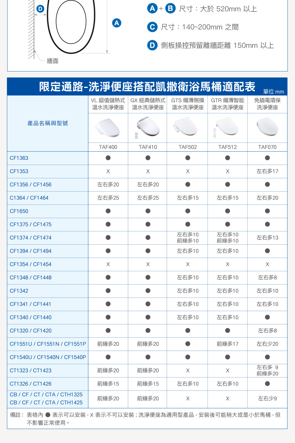表格內 ● 表示安裝正確時最適合配對,便座為通用型產品,安裝後可能稍大或是小於馬桶,但不影響正常使用。