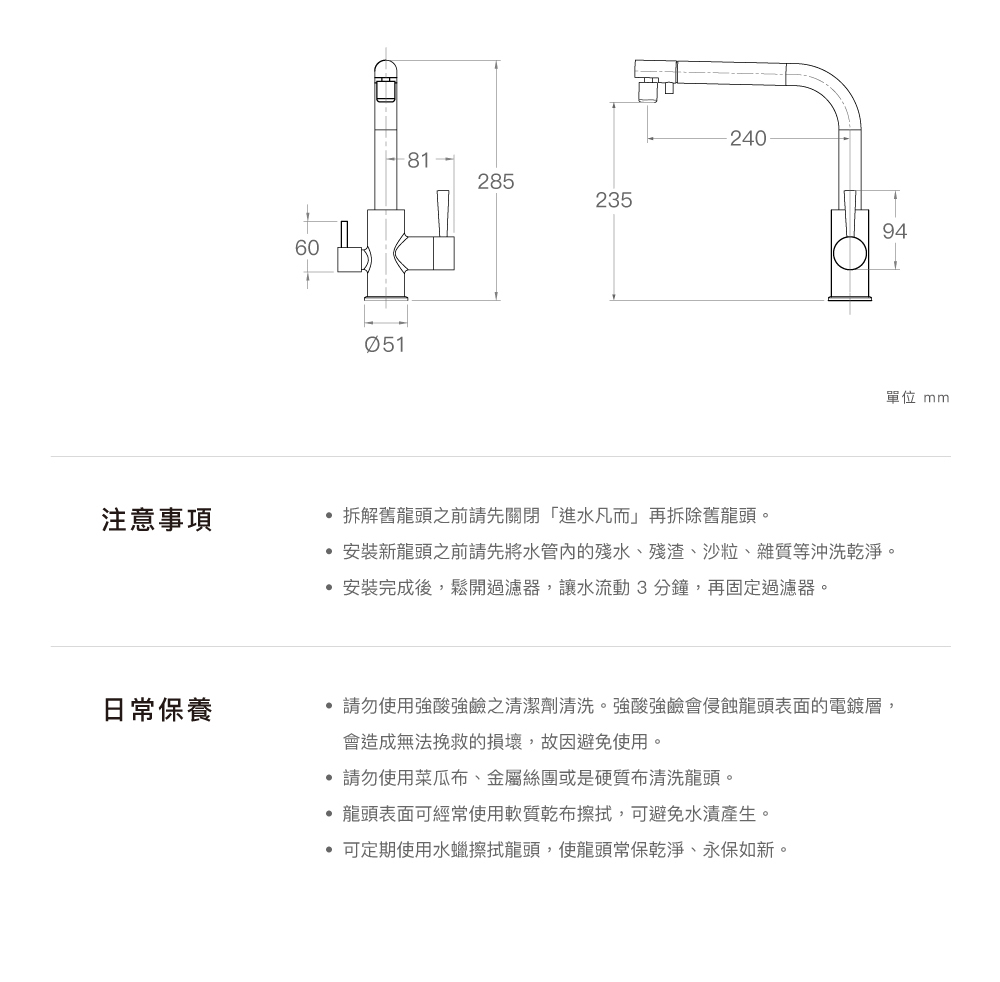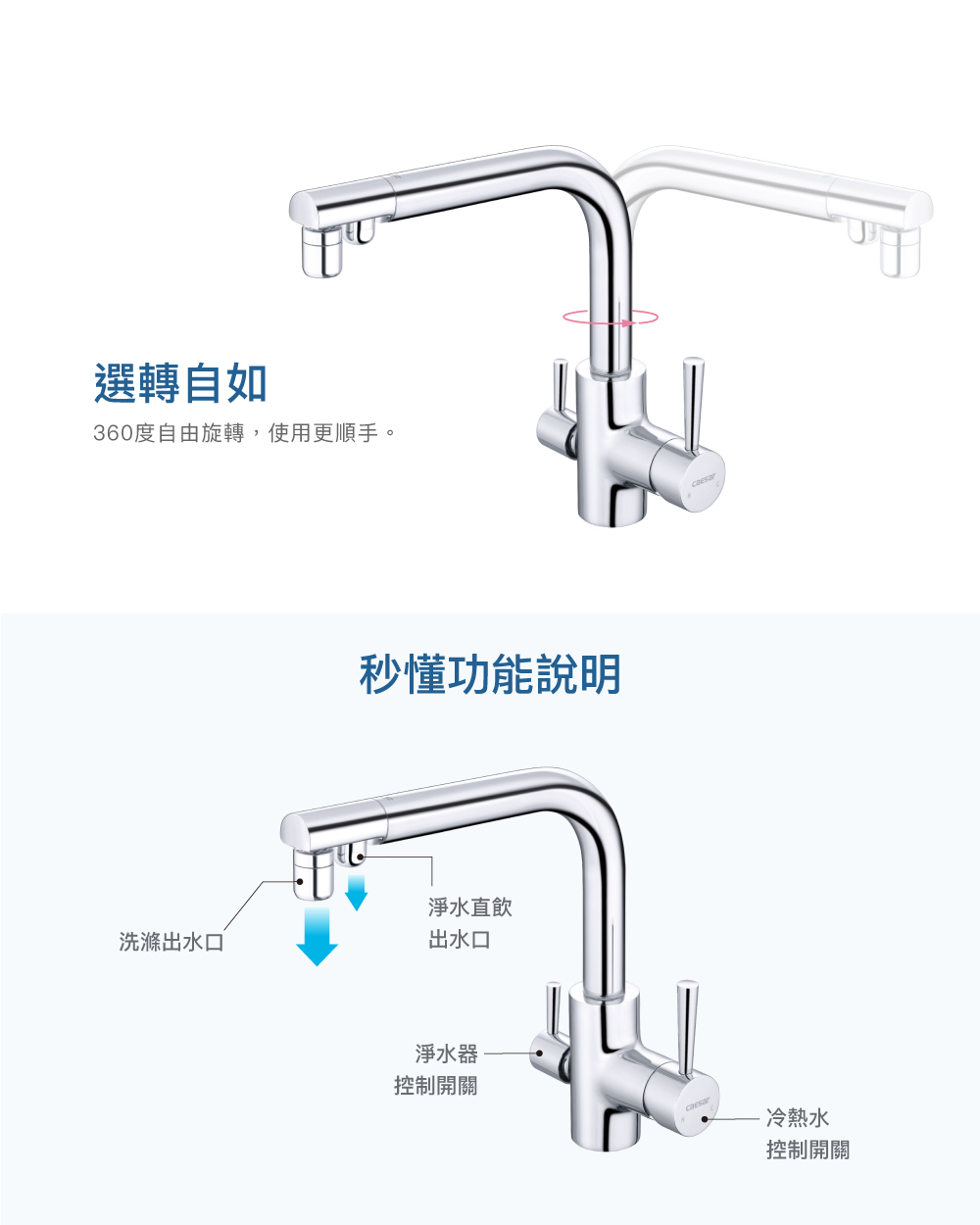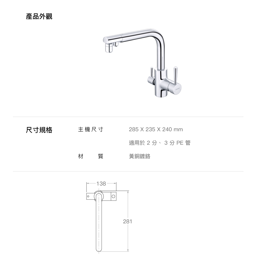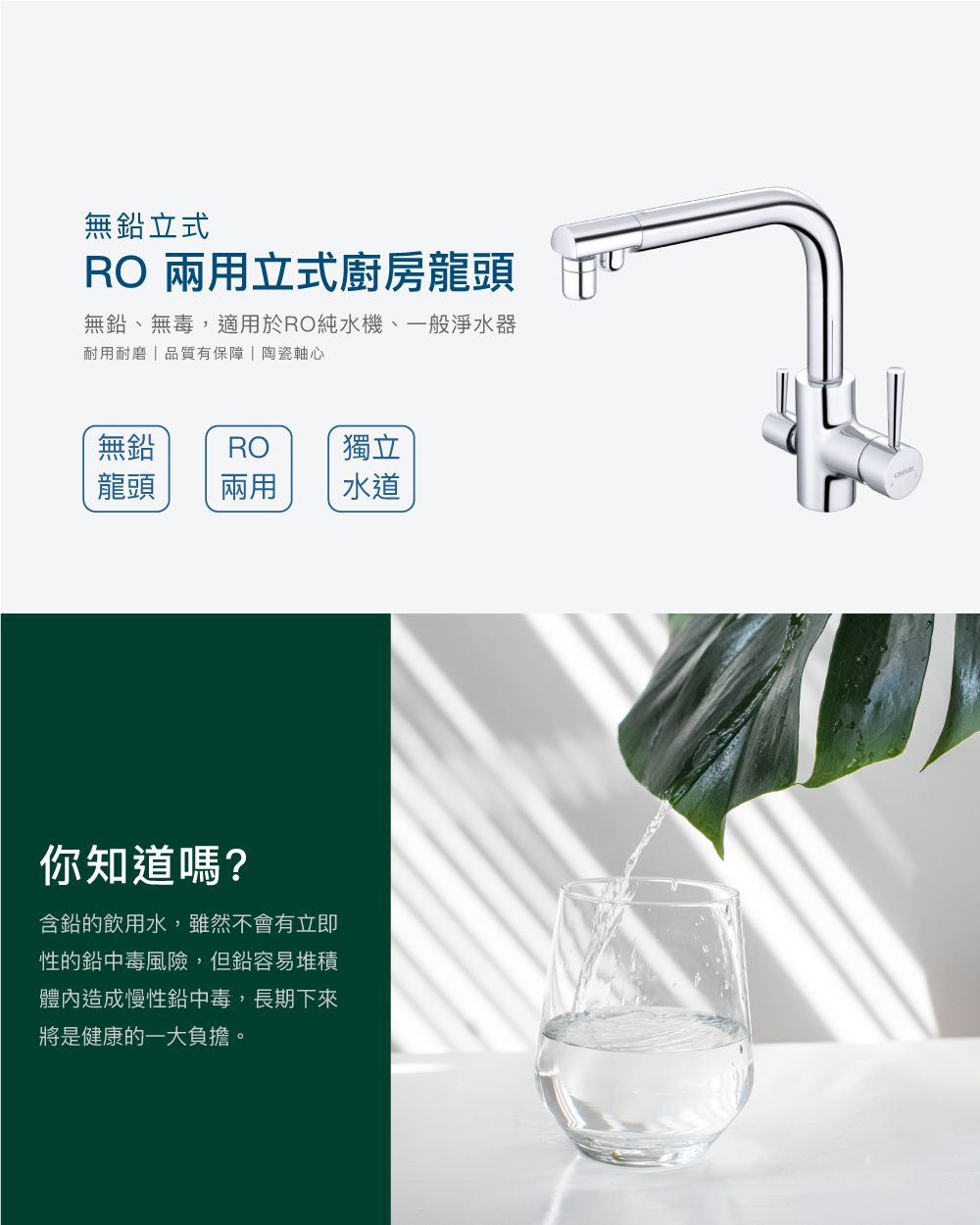 ● 三合一無鉛龍頭:冷水、熱水、RO 過濾水。