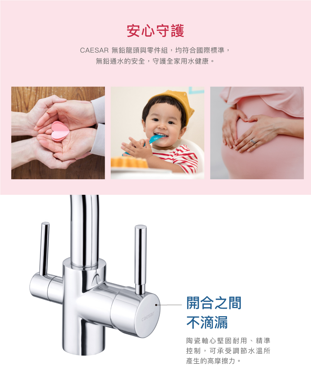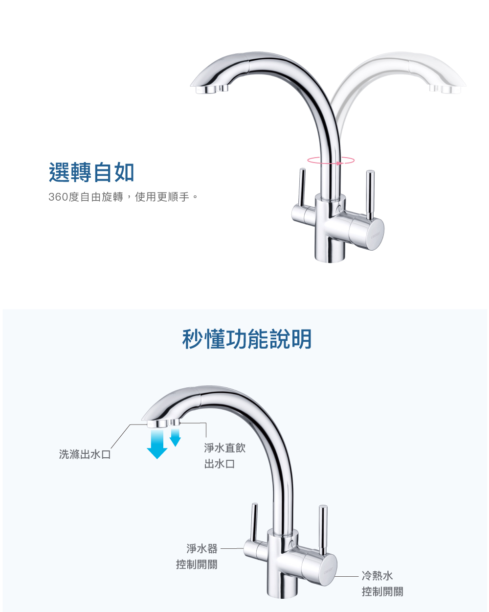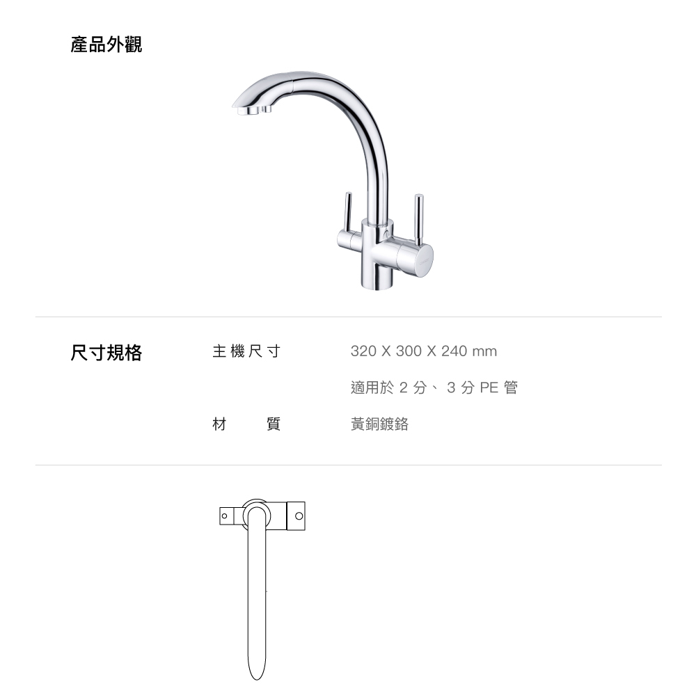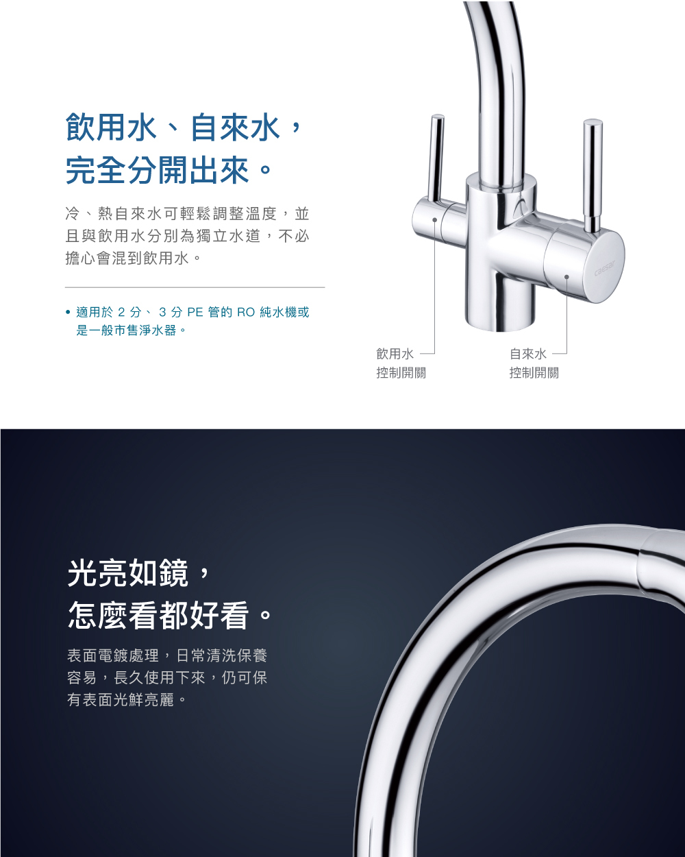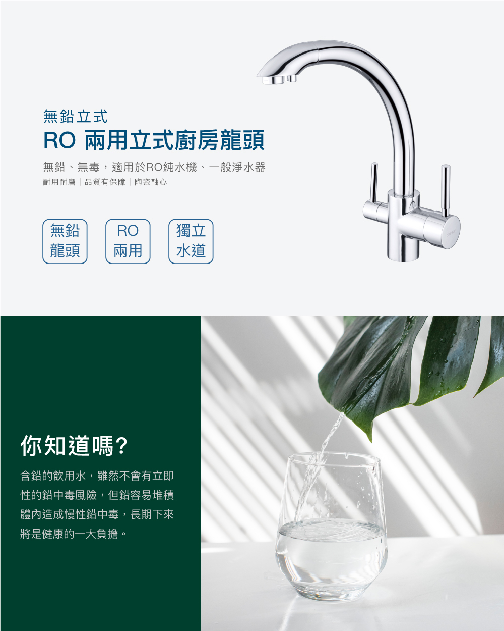 ● 三合一無鉛龍頭:冷水、熱水、RO 過濾水。