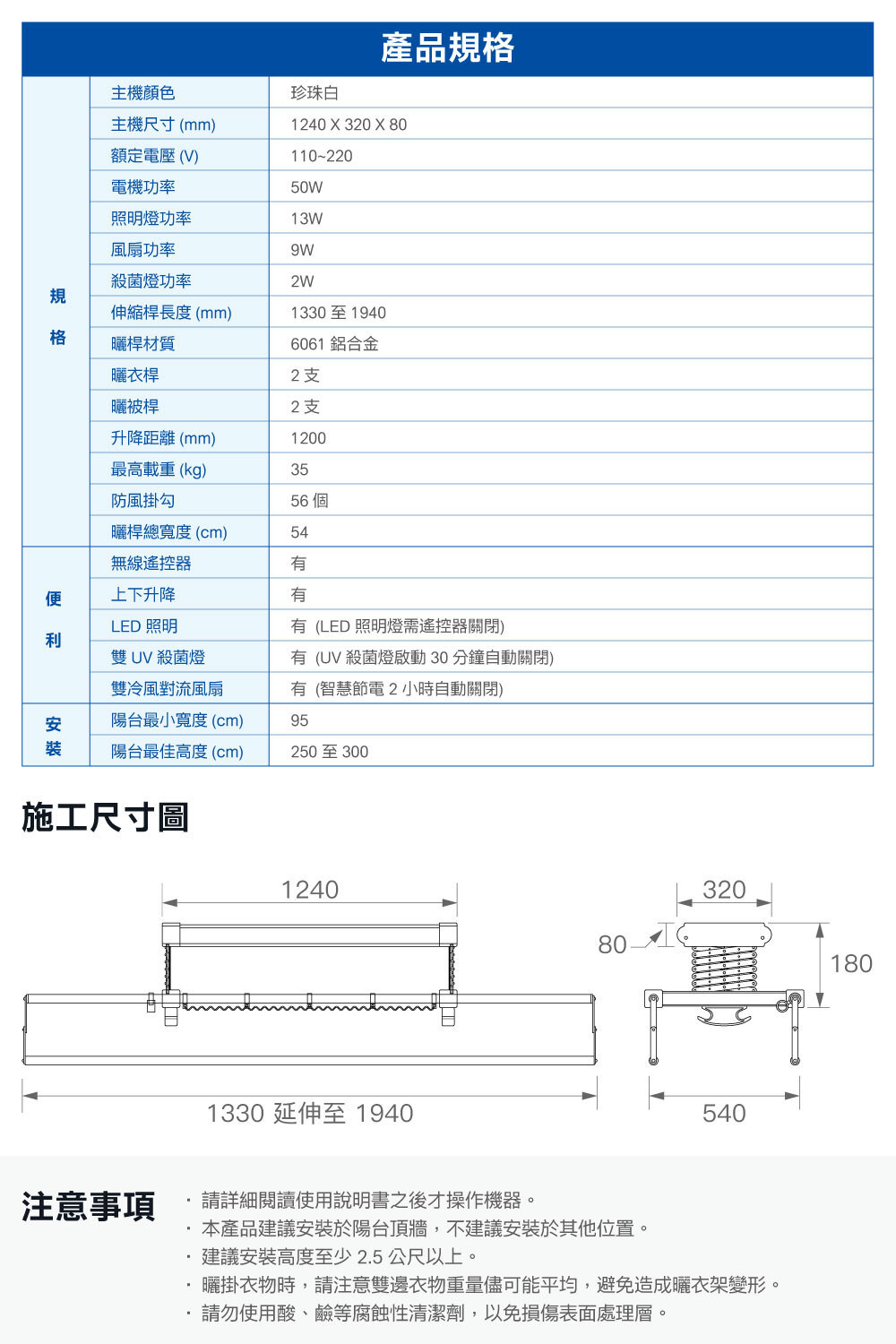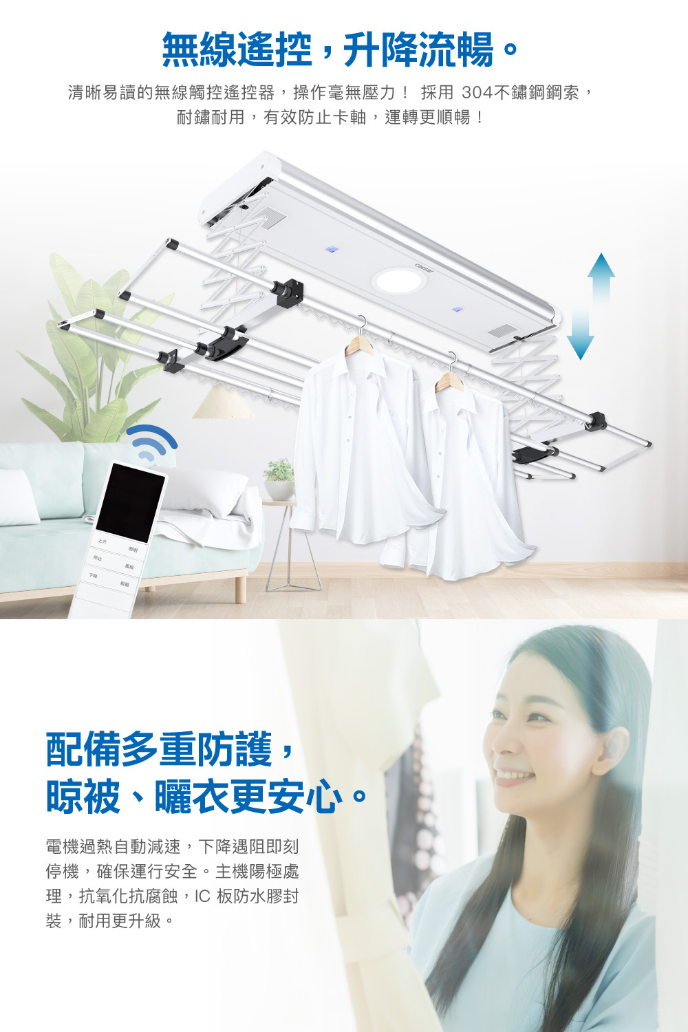 ● 最長升降達120cm,曬被不怕碰地