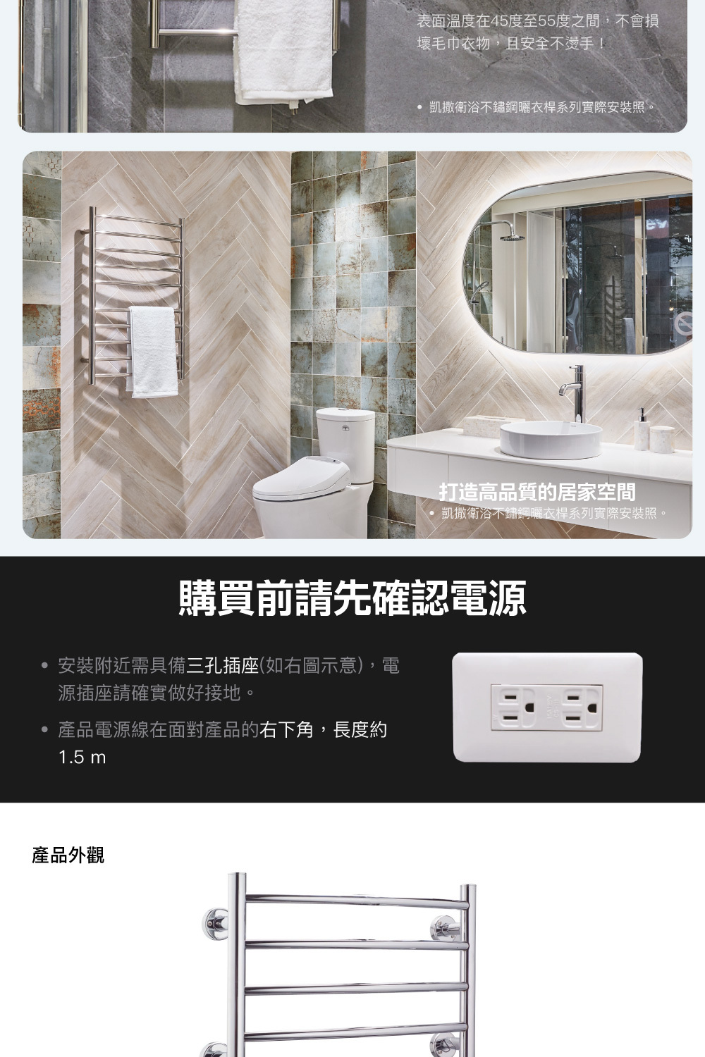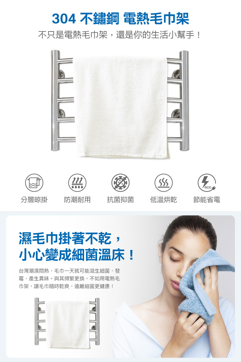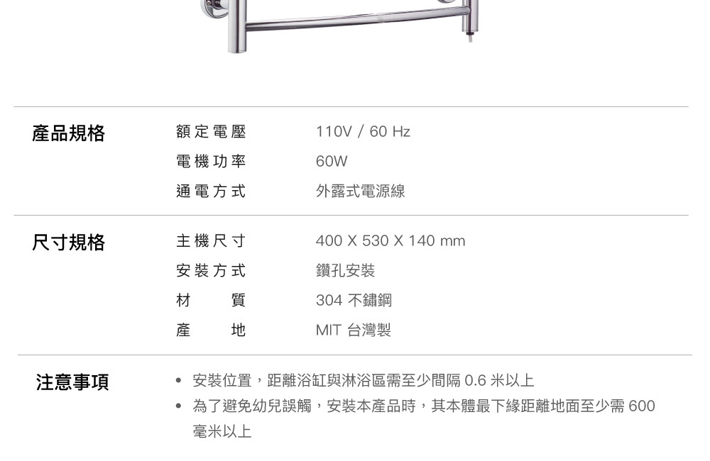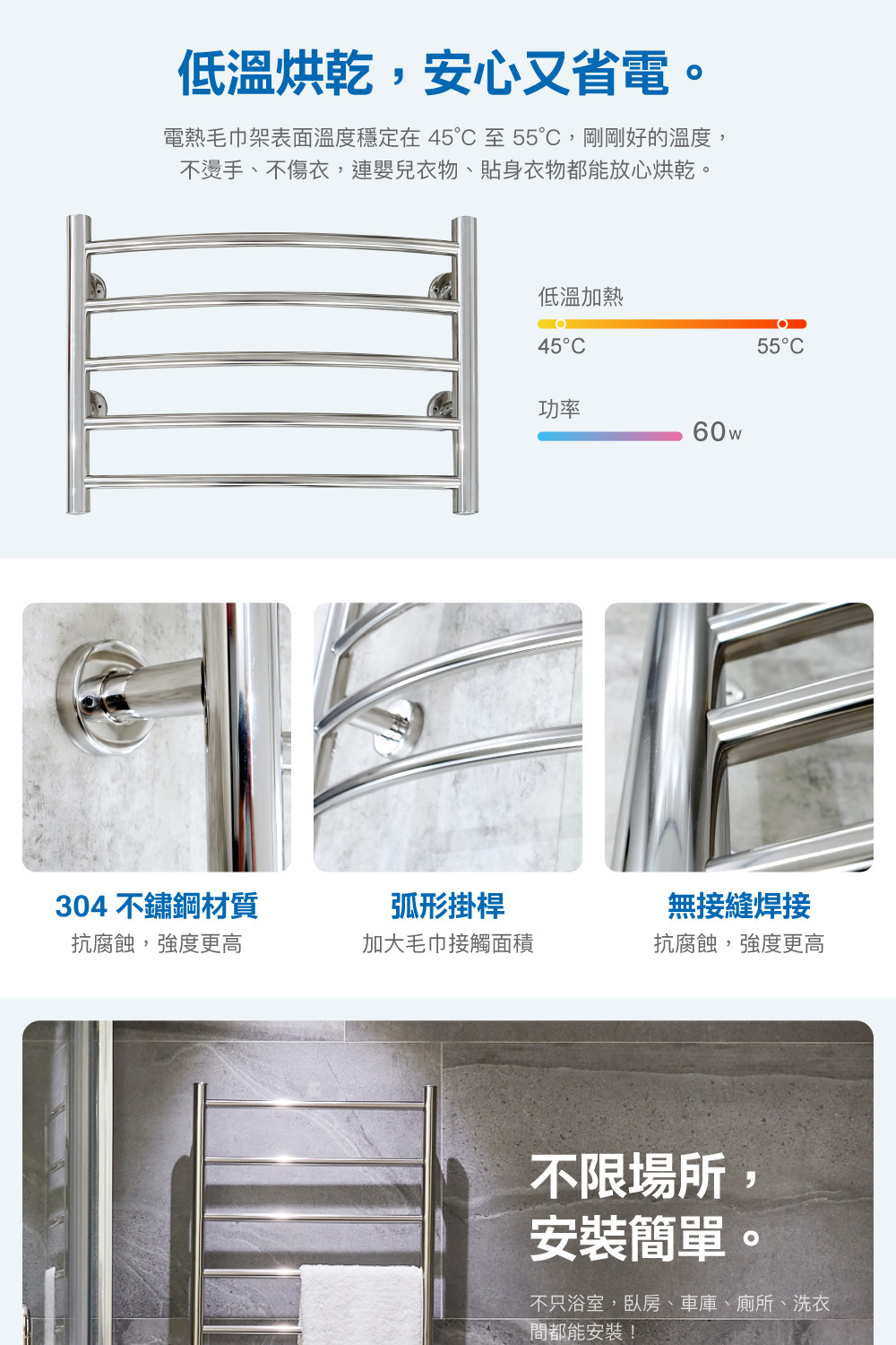 ● 不燙手,柔和烘乾毛巾,保持乾爽無異味
